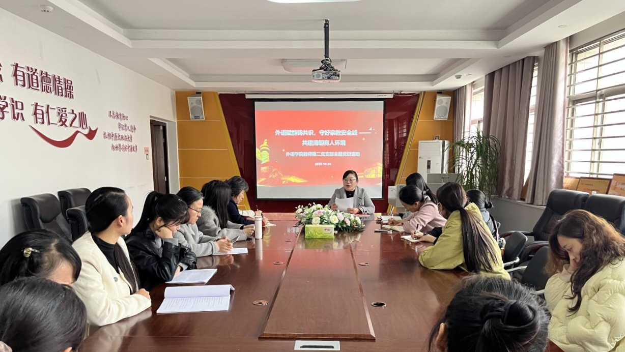 为深入学习贯彻《中国共产党统一战线工作条例》中关于民族宗教工作的核心内容,进一步增强党员教师对民族宗教工作重要性的认识,10月24日下午外语学院教师第二党支部在梁园校区应天楼214党员活动室组织召开了“外语赋能铸共识,守好宗教安全线 ——共建清朗育人环境”主题党日活动。活动由外语学院教师第二党支部书记刘敏同志主持,所有教师党员共同参加。