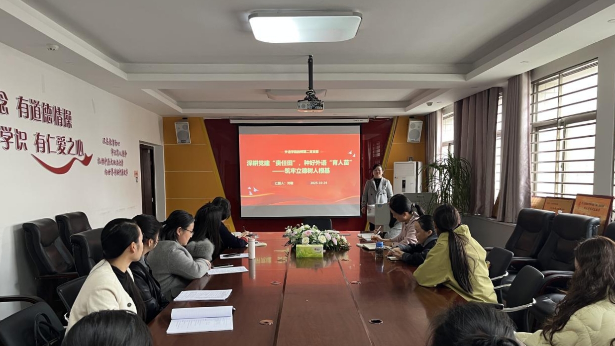 2025年10月24日下午,外语学院教师第二党支部书记刘敏在梁园校区应天楼214党员活动室以“深耕党建‘责任田’,种好外语‘育人苗’——筑牢立德树人根基”为题讲授了一堂内涵深刻、导向鲜明的专题党课。本次党课紧扣“党建引领外语教育高质量发展”核心主线,聚焦党建与外语教育深度融合的实践路径,旨在进一步凝聚育人共识、强化责任担当,为扎实推进立德树人根本任务落地见效筑牢思想与组织根基。