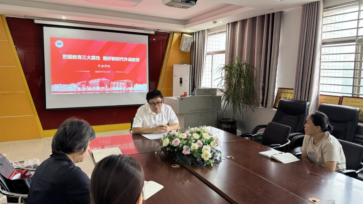 紧接着,外语学院党委书记朱震杰以《把握教育三大属性,做好新时代外语教育》为题作了专题报告。朱书记围绕教育的 “政治属性、社会属性、育人属性” 三大核心维度,系统阐释了新时代外语教育的使命担当与发展路径。朱书记强调,外语教育作为国家对外开放和文化交流的重要支撑,必须坚持社会主义办学方向,把牢意识形态工作领导权。要通过外语教学传递中国声音、讲好中国故事,培养具有坚定政治立场、深厚家国情怀的国际化人才,为国家外交事业、国际合作与竞争提供坚实人才保障。