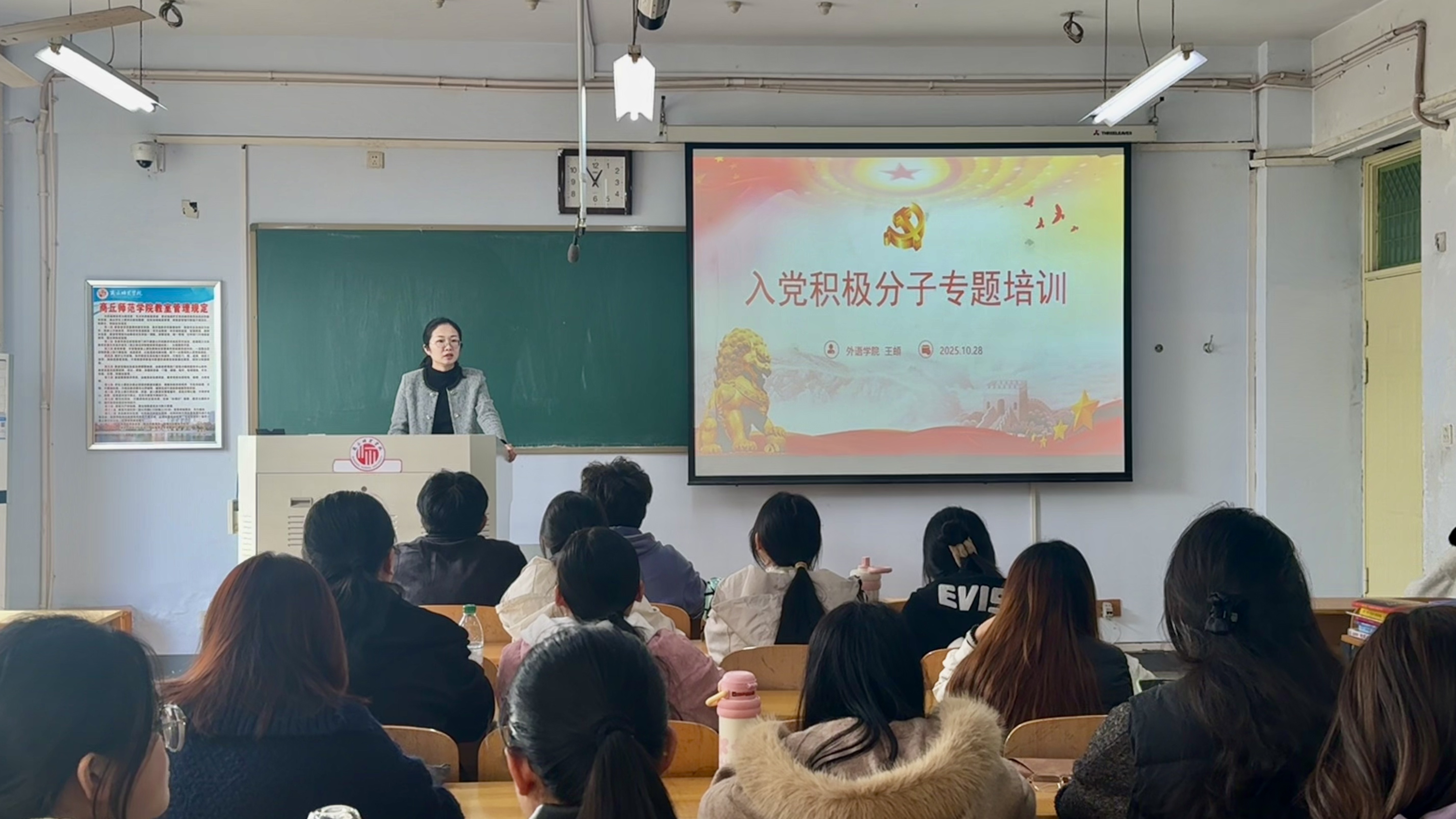 为进一步筑牢入党积极分子思想根基,端正入党动机,明确入党目的,找准努力方向,2025年10月28日中午,外语学院2025年下半年入党积极分子培训在智圆楼217教室开讲,本次培训由外语学院党委副书记王頔授课,2025年下半年(第57期)入党积极分子参加。