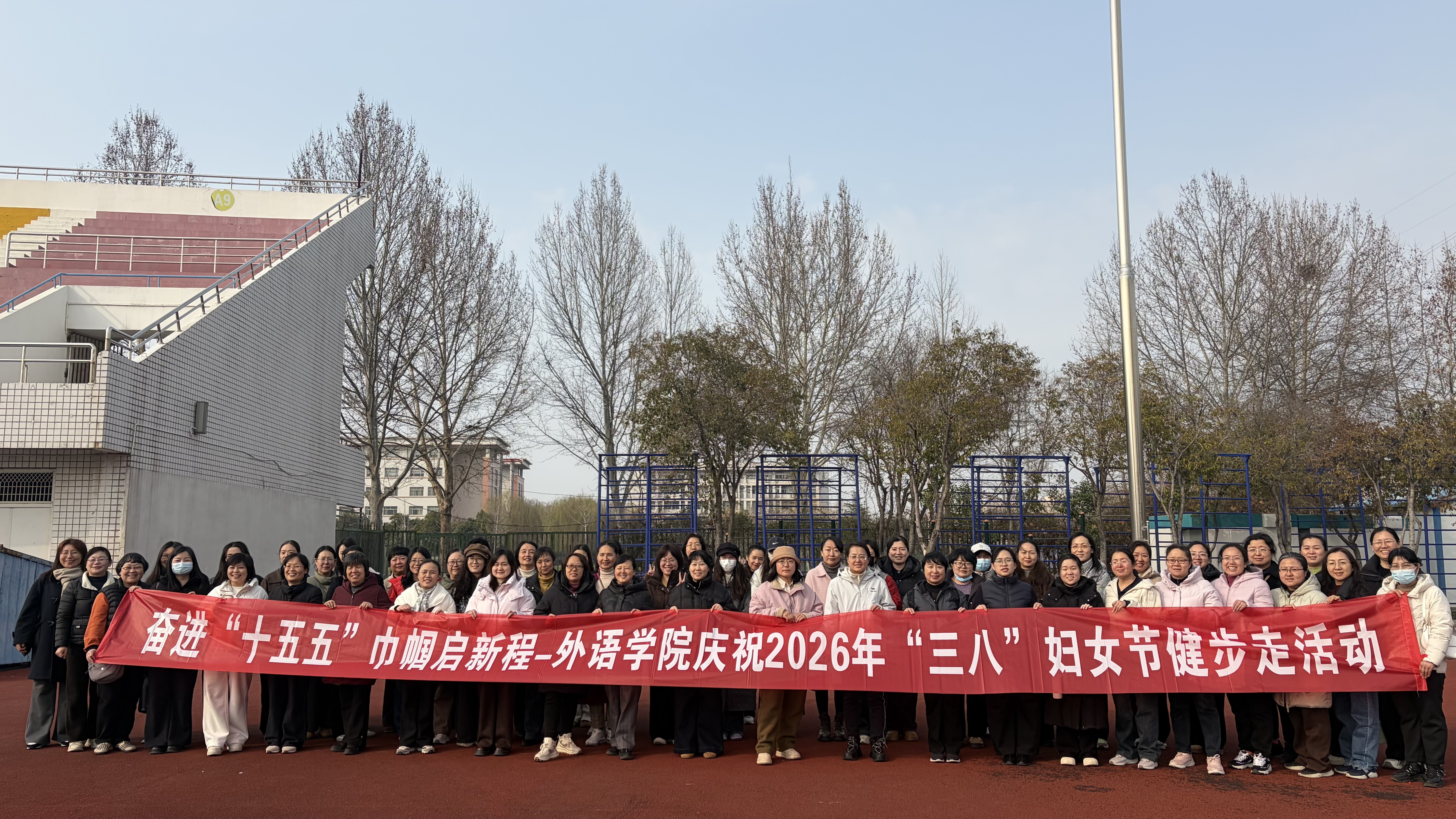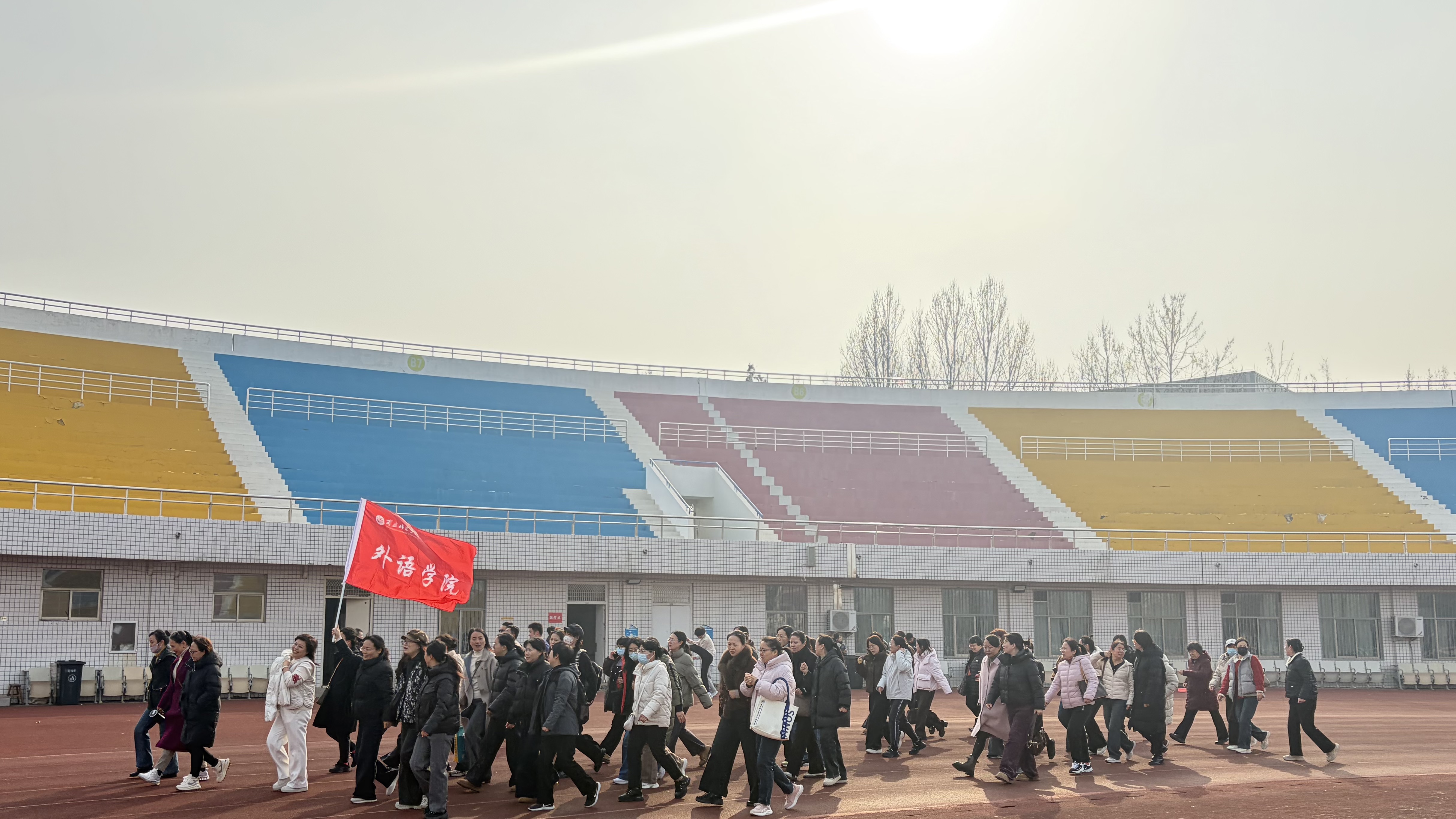阳春三月,春风和煦,草木含章。在第116个“三八”国际妇女节来临之际,为深入学习贯彻党的二十届历次全会精神,响应“十五五”规划开局之年的号召,团结引领学院女教职工坚定不移听党话、跟党走,展现新时代女性自尊、自信、自立、自强的精神风貌,外语学院于3月6日下午在梁园校区体育场举行了“奋进‘十五五’巾帼启新程”——庆祝“三八”国际妇女节健步行活动,学院全体女教职工以昂扬姿态赴春日之约,以奋进步伐启时代新程。