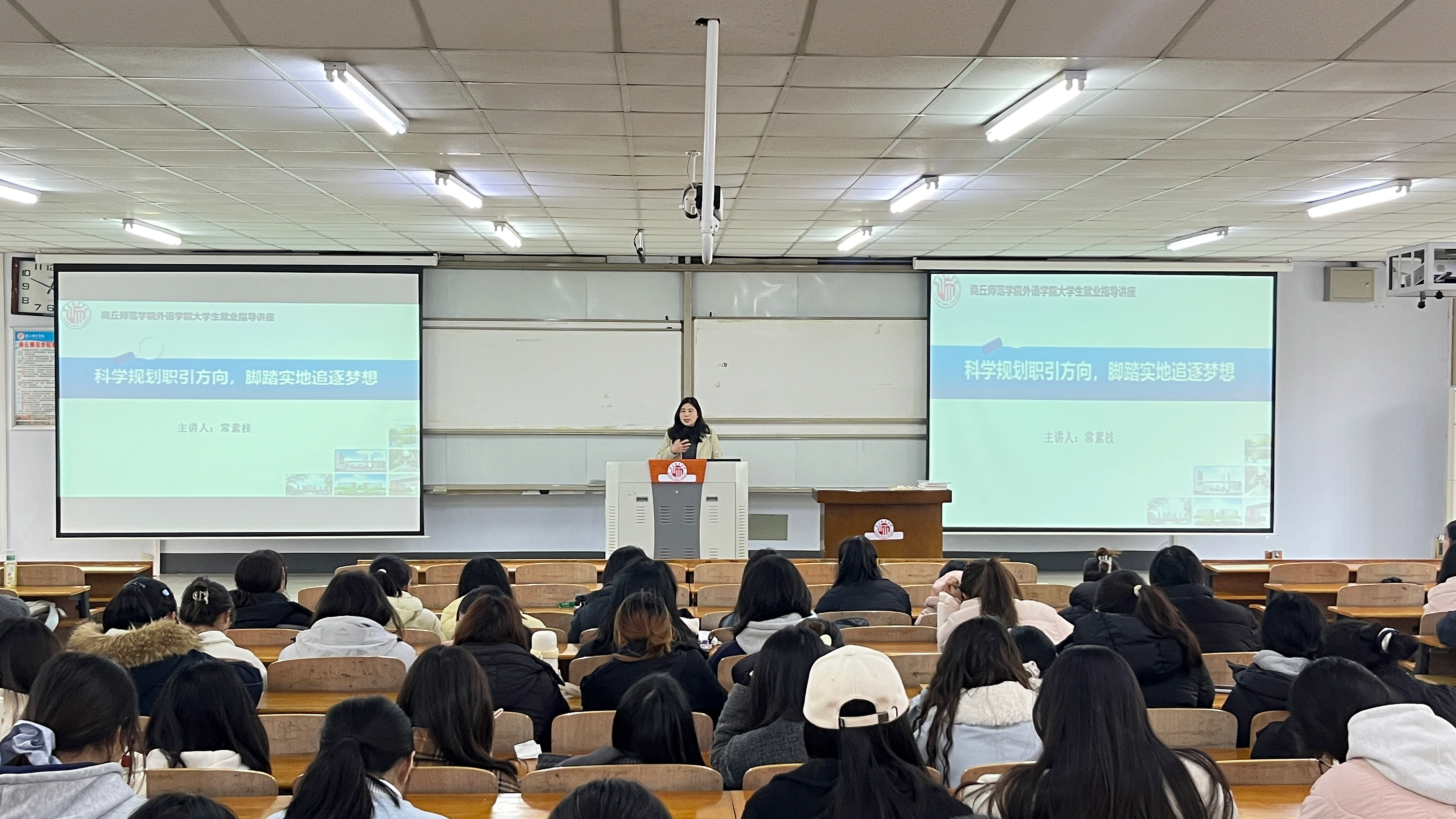 为精准破解外语学院学生职业发展迷茫,助力其树立清晰就业目标,2026年3月9日,外语学院于智圆楼110教室举办大学生就业指导专题讲座。本次讲座由外语学院学工办主任常素枝主讲,2022级、2023级学生代表参加。