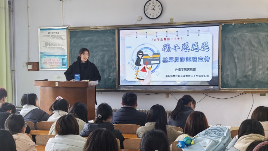 答辩现场精彩纷呈,各实践团队通过PPT展示,生动再现了寒假社会实践活动的丰硕成果。其中,“文物保护宣传”团队立足专业特色,通过双语讲解、文化导览等形式,向群众普及文物知识,用外语讲述中华文明故事,增强公众文物保护意识;“骗子退退退”反诈宣传队则别出心裁,将防诈骗知识编成朗朗上口的顺口溜,走村入户开展趣味宣传,以青春智慧守护群众“钱袋子”;“童声起航,英语‘音’你而暖”支教团队充分发挥专业优势,为乡村儿童量身打造趣味英语课堂,在寓教于乐中点亮孩子们的英语学习梦想。各团队从项目背景、实践过程、成果转化、社会价值等方面进行全面展示,充分展现了外院学子扎根基层、服务社会的青春担当。在答辩点评环节,评委老师们对各团队的实践成果给予充分肯定,并结合项目特色进行精准指导。各团队在评委老师的指导下,认真梳理实践过程中的不足,深刻反思存在的问题,并转化为改进动力,为今后开展更高质量的实践活动奠定坚实基础。