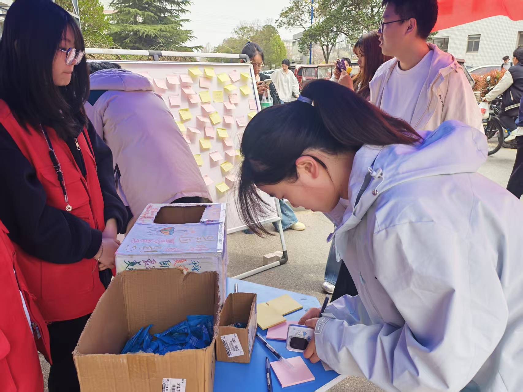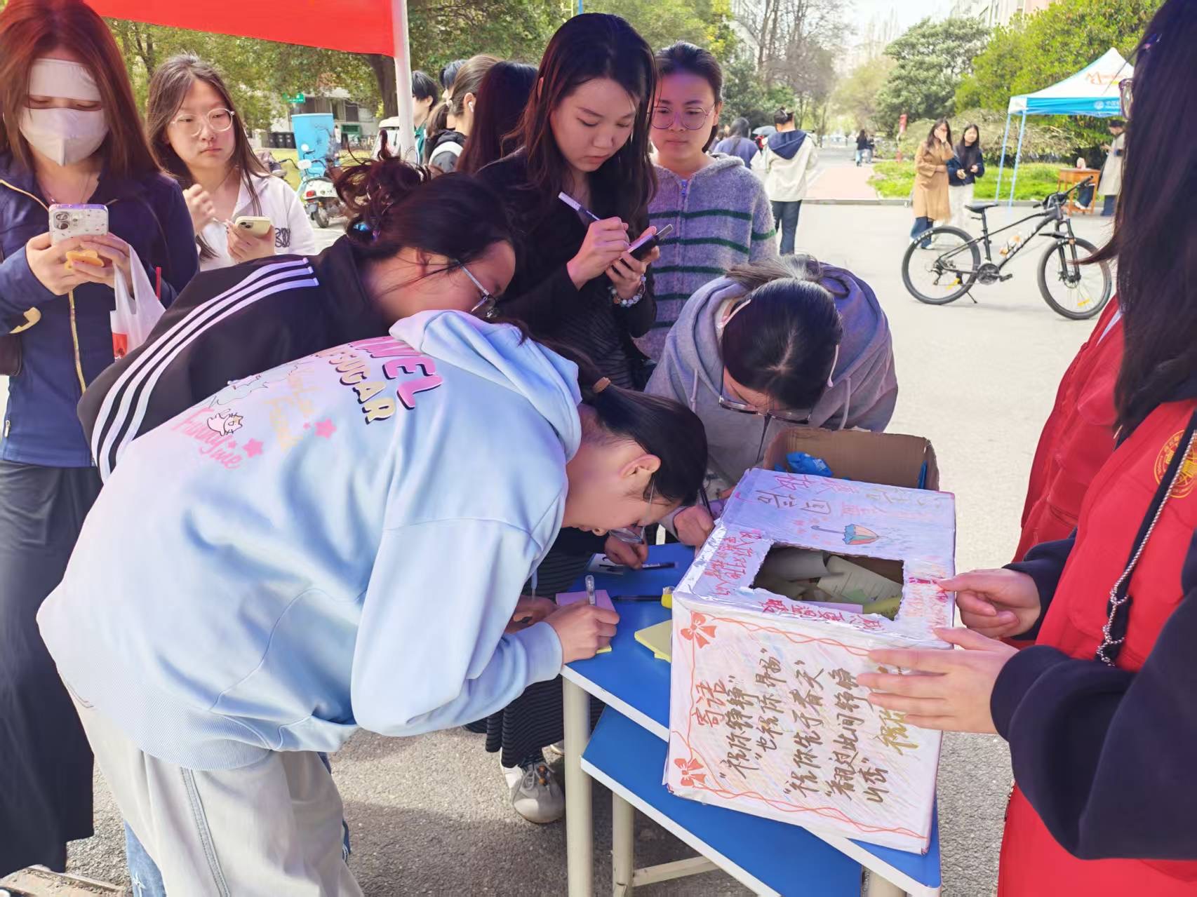 为关注大学生心理健康,营造温暖互助的校园氛围,3月27日,外语学院在梁园校区随园餐厅南门面向全校学生开展“心语展板,盲盒回信”校园心理互动交换活动。