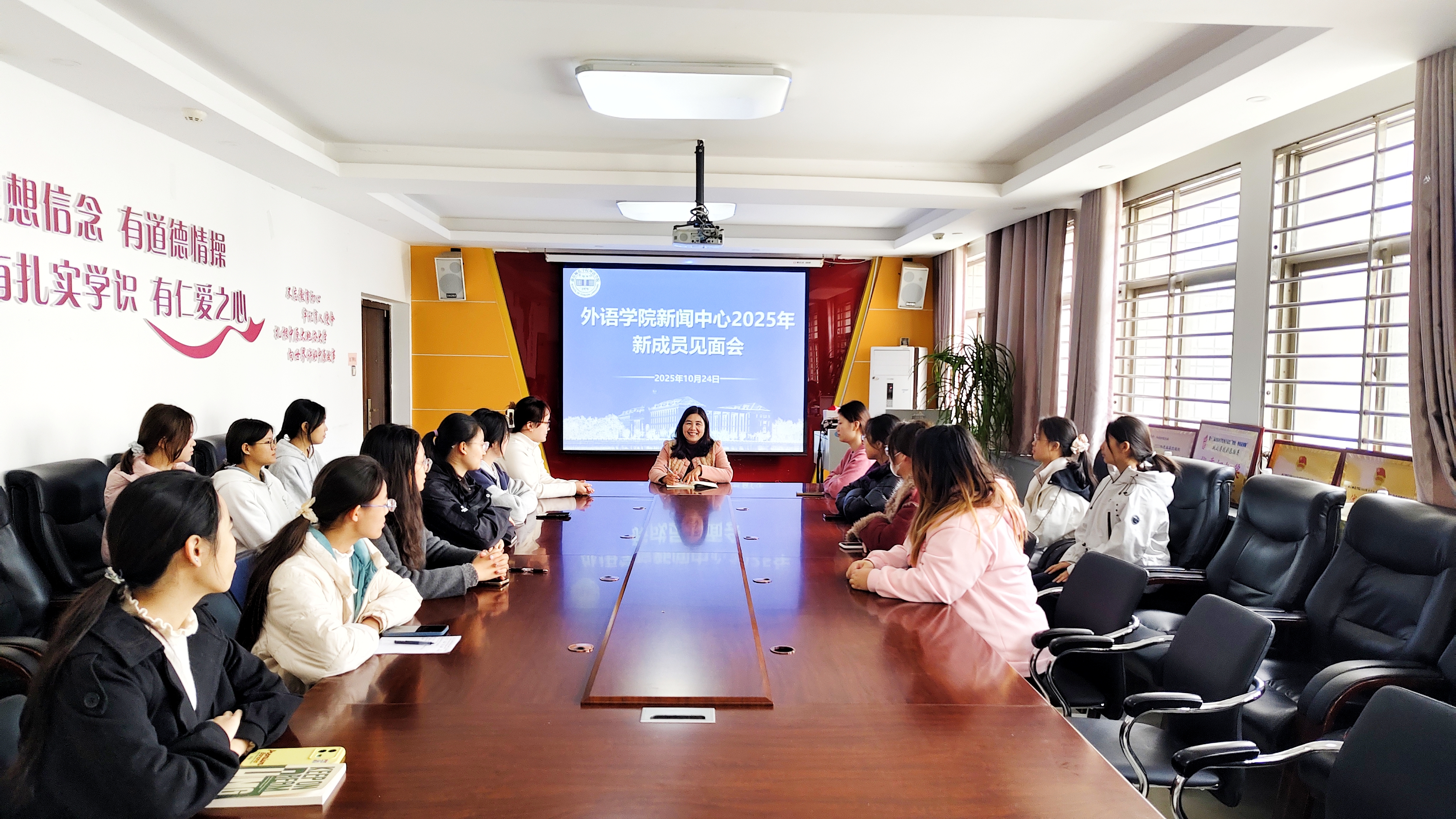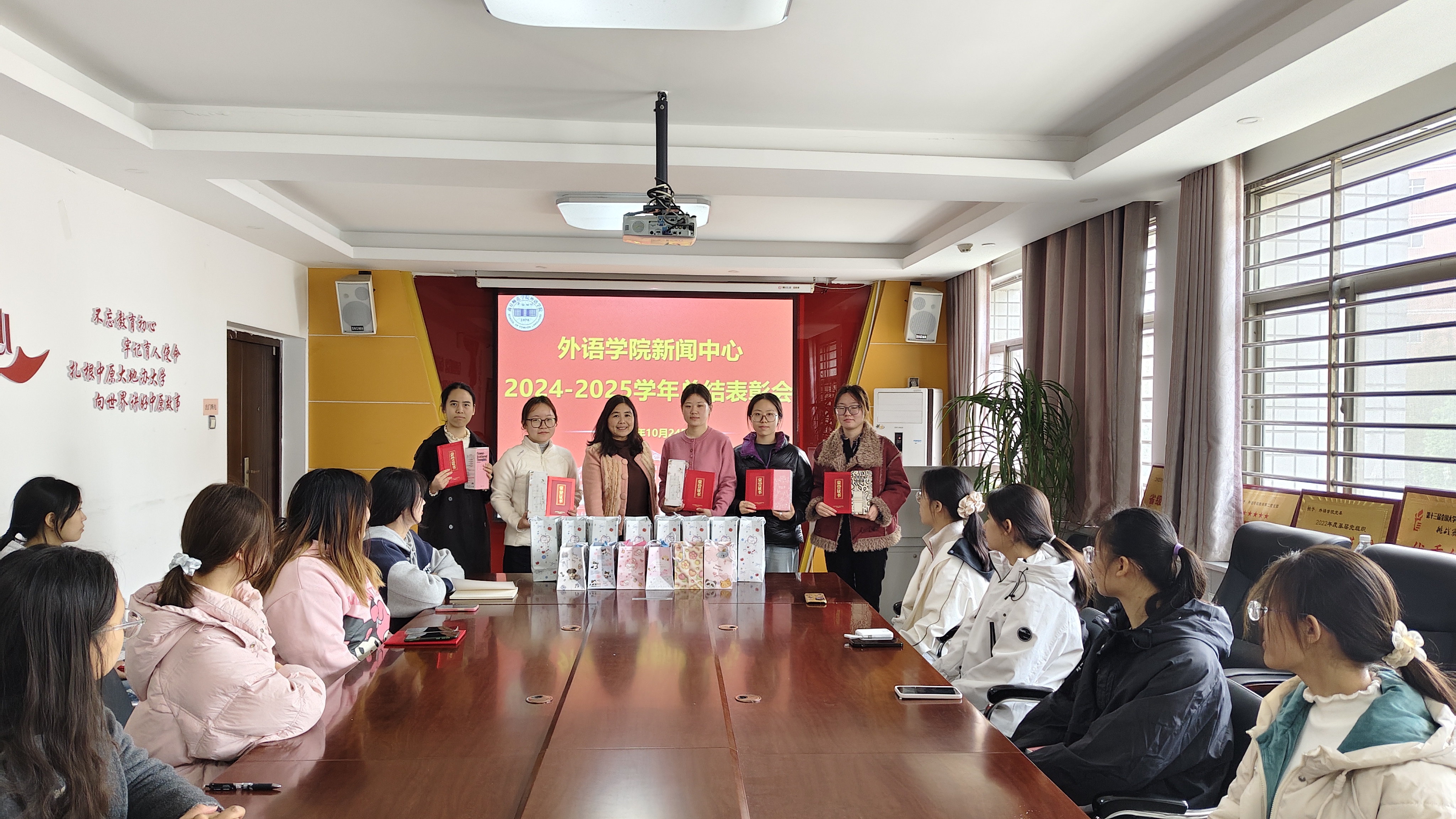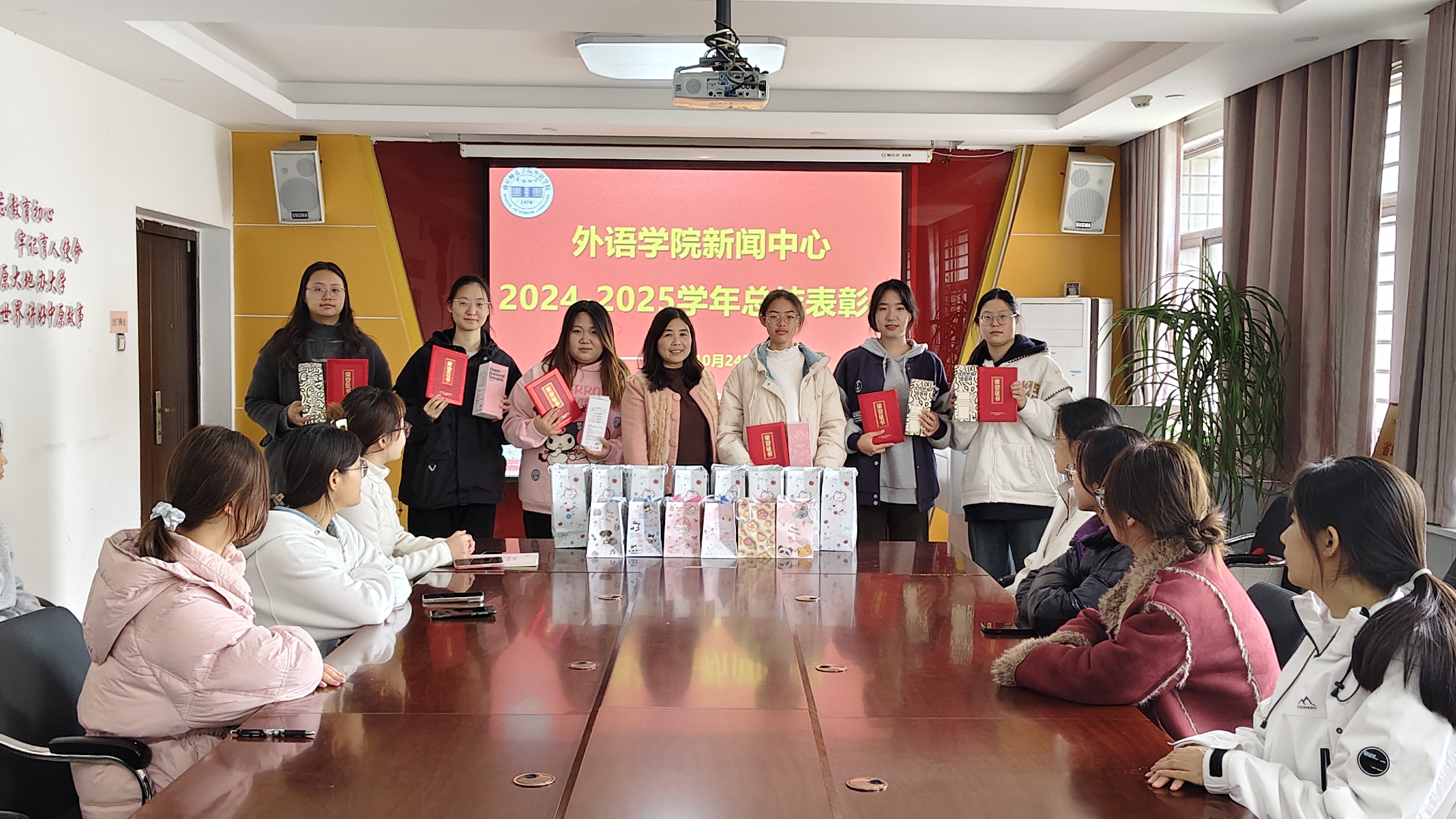 为表彰先进,更好地开展信息宣传工作,提升影响力和服务力,10月24日中午,外语学院新闻中心于应天楼214会议室举行2024-2025学年总结表彰会暨第五届部长聘任仪式,外语学院学工办主任、新闻中心负责人常素枝及新闻中心全体成员参加。