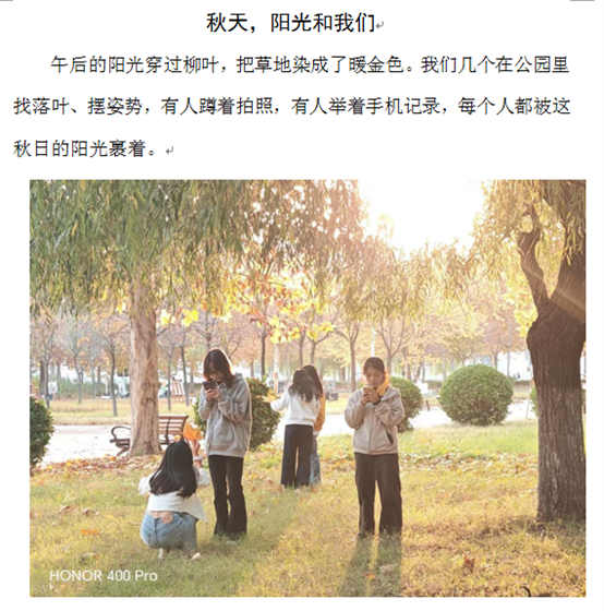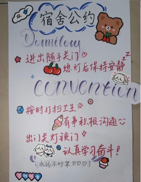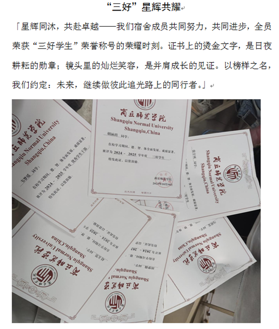 活动启动后,各宿舍踊跃参与,用镜头捕捉宿舍生活的精彩瞬间。参赛作品中,有宿舍精心记录下共同拟定宿舍公约、明确生活规范的和谐时刻,那一笔一划间满是对有序生活的追求;有宿舍将全员荣获“三好学生”等共同进步的荣耀时刻定格,灿烂笑容洋溢着并肩成长的喜悦,证书上的烫金文字是日夜耕耘的见证;还有宿舍以落叶为创意道具,在树下拍摄趣味合影,大家用叶子遮脸、比出多样手势,灵动画面尽显青春活力。每一份作品都配有细腻的文字说明,将宿舍成员间的默契、情谊娓娓道来。