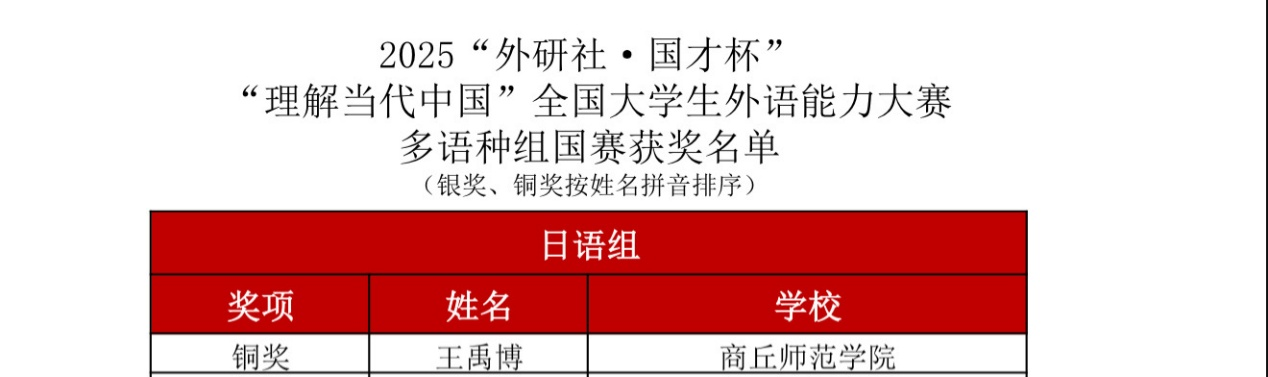 12月8日,2025“外研社·国才杯”“理解当代中国”全国大学生外语能力大赛圆满落幕。在大赛多语种日语组获奖选手中,我院日语专业2022级王禹博同学在国赛中取得铜奖。并在省赛中王禹博同学荣获特等奖;2023级郭志信同学获得二等奖;2023级史慧骐、李怡彤获得三等奖,取得突破性成绩。