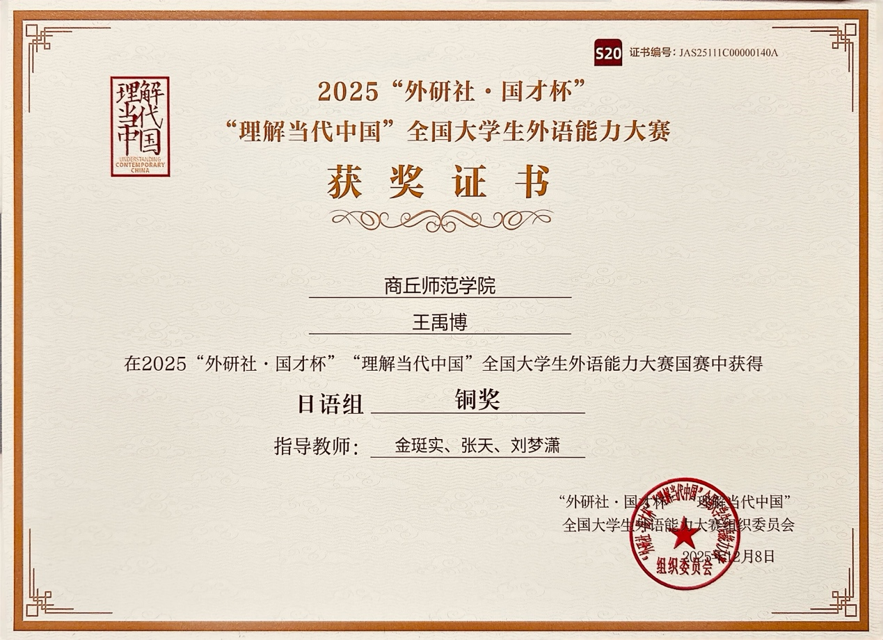 12月8日,2025“外研社·国才杯”“理解当代中国”全国大学生外语能力大赛圆满落幕。我院学子在这一国家级高端赛事舞台上展现出众实力,斩获亮眼成绩——2022级日语专业王禹博(指导老师:金珽实、张天、刘梦潇)凭借扎实的专业功底,摘得多语种日语组国家级铜奖。