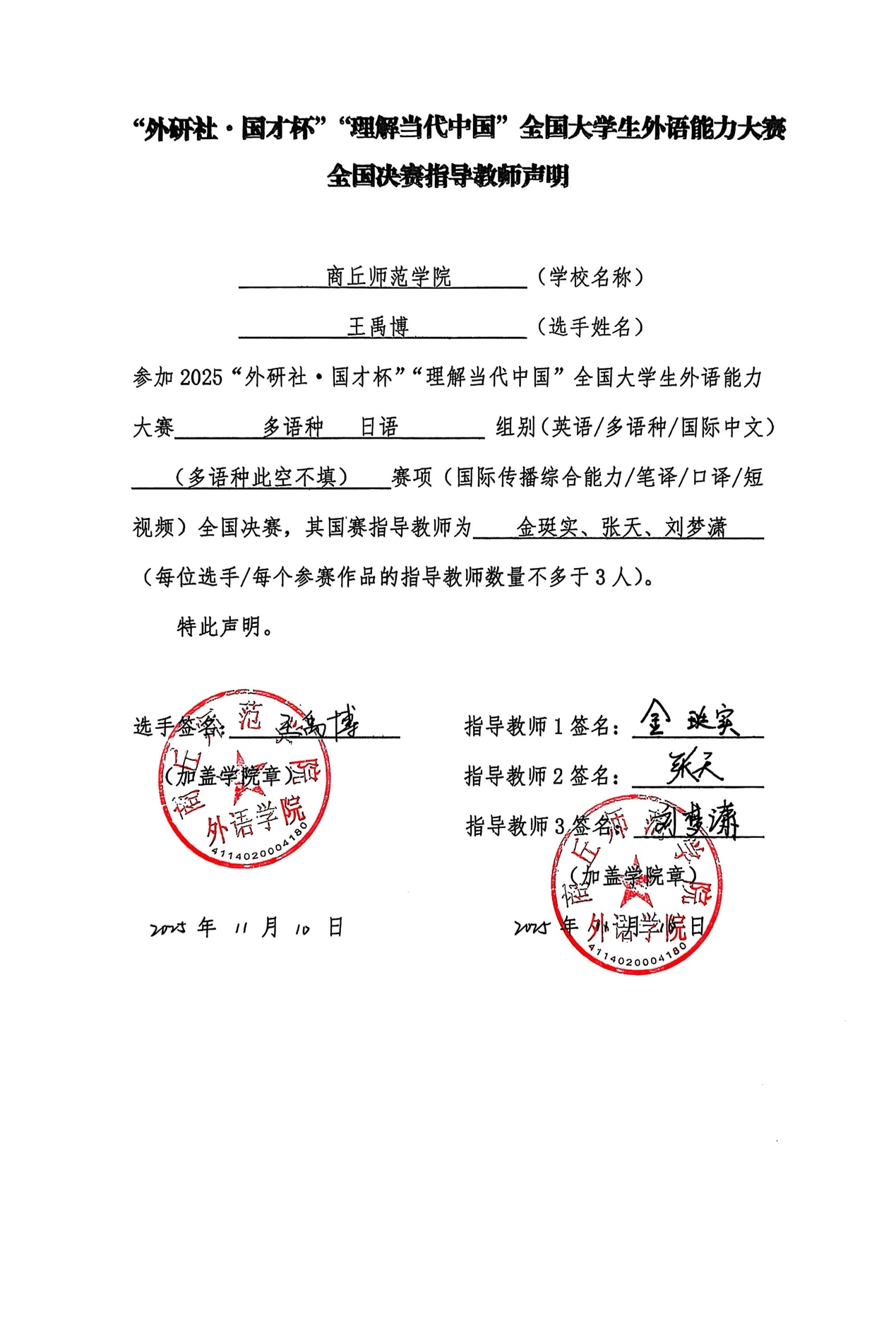 国赛指导教师声明