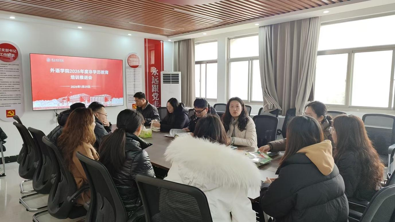 1月29日,外语学院于应天楼212会议室组织召开了2026年度非学历教育培训推进会。学院党委书记朱震杰、院长杨静、党委副书记王頔以及非学历教育骨干教师出席了此次会议。会议由外语学院院长杨静教授主持。